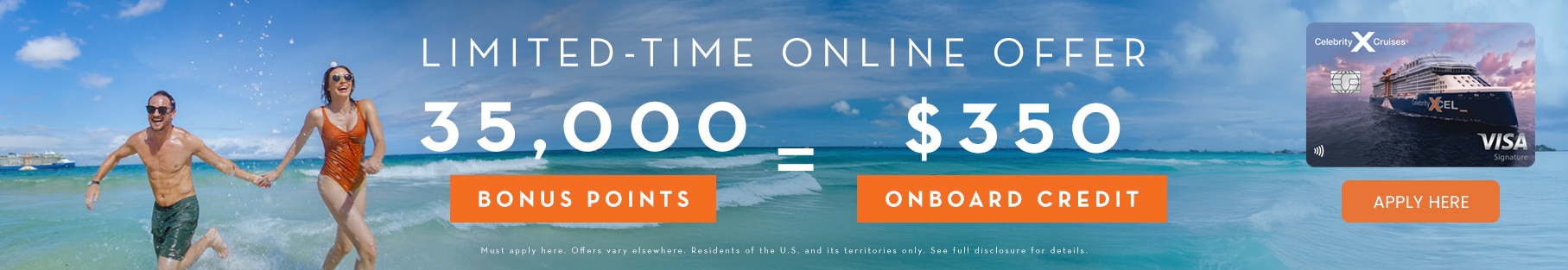 Don’t forget to explore our year-round cruise deals, including special discounts for suite guests of The Retreat, military members, and more. Learn all about our special offers and perks for members of our cruise rewards program, Captain’s Club. Plus, sign up for a Celebrity Visa Signature credit card and earn 10,000 MyCruise Reward points, which you can redeem on future vacations or onboard credit.